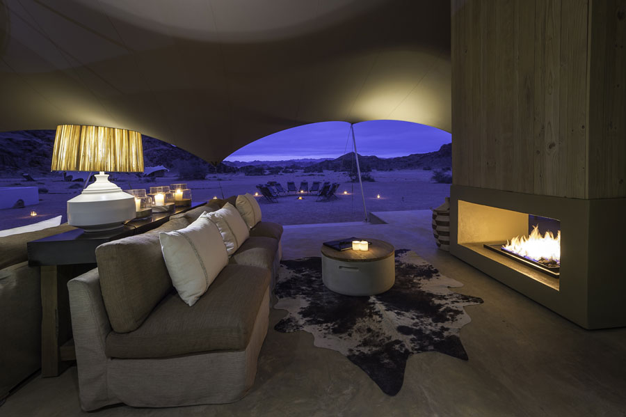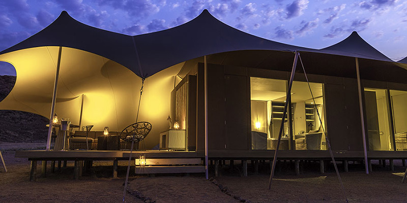 Set in a broad valley between the Palmwag Concession and the iconic Skeleton Coast, at the point where two tributaries of the Hoanib River meet, this camp is in a very remote area of the Kaokoveld, only accessible by light aircraft.