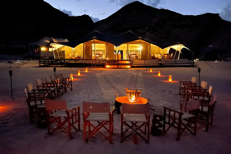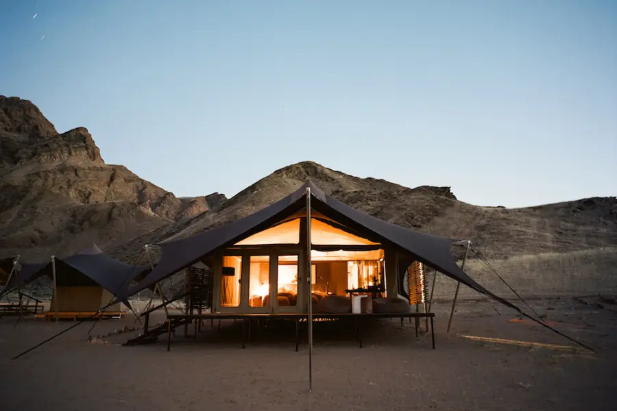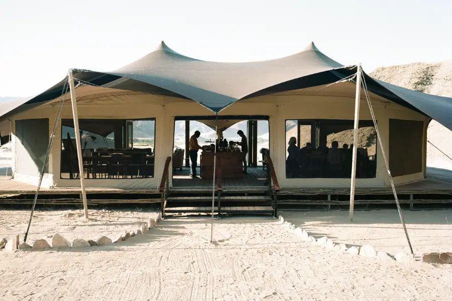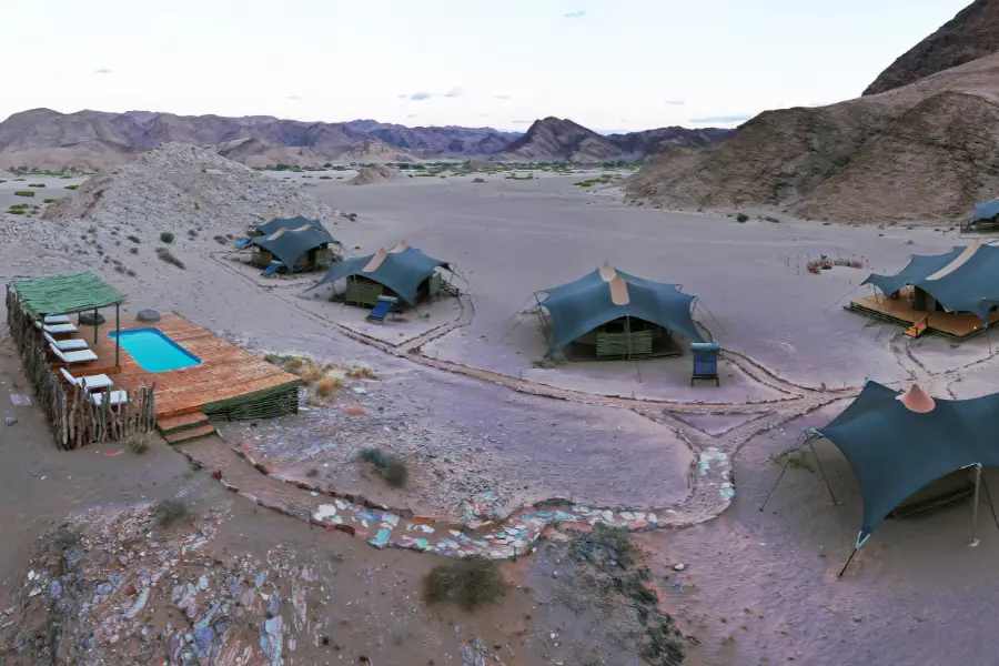 Located in the Sesfontein Community Conservancy, the camp is set within a hidden valley, encompassed by jagged mountains just outside the private 500 square kilometre Palmwag Concession.
