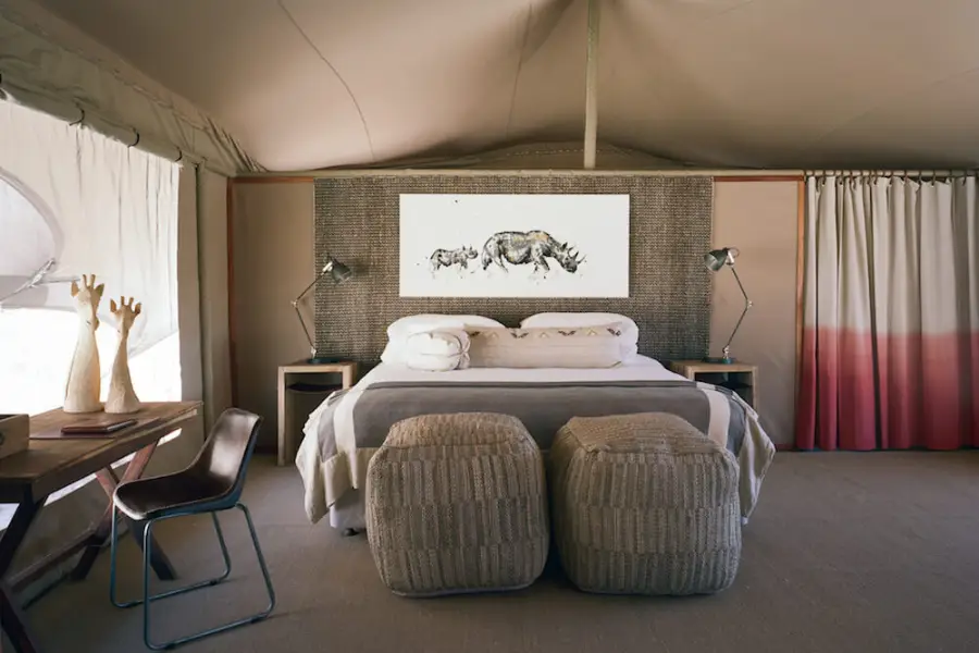 The accommodation comprises just six stunning en suite guest tents (one family tent) that pair simplicity with style, and elegant décor found throughout, crafted by local Rundu carpenters and Himba carvers, along with baskets weaved by the people of the Omba Project in Windhoek. Powered completely by solar and with tents built on decks made of a wood, bamboo and 70% recycled-material composite, the camp offers an intimate affair that immerses guests into the wilds of the desert whilst keeping its footprint to a minimum in this delicate ecosystem.