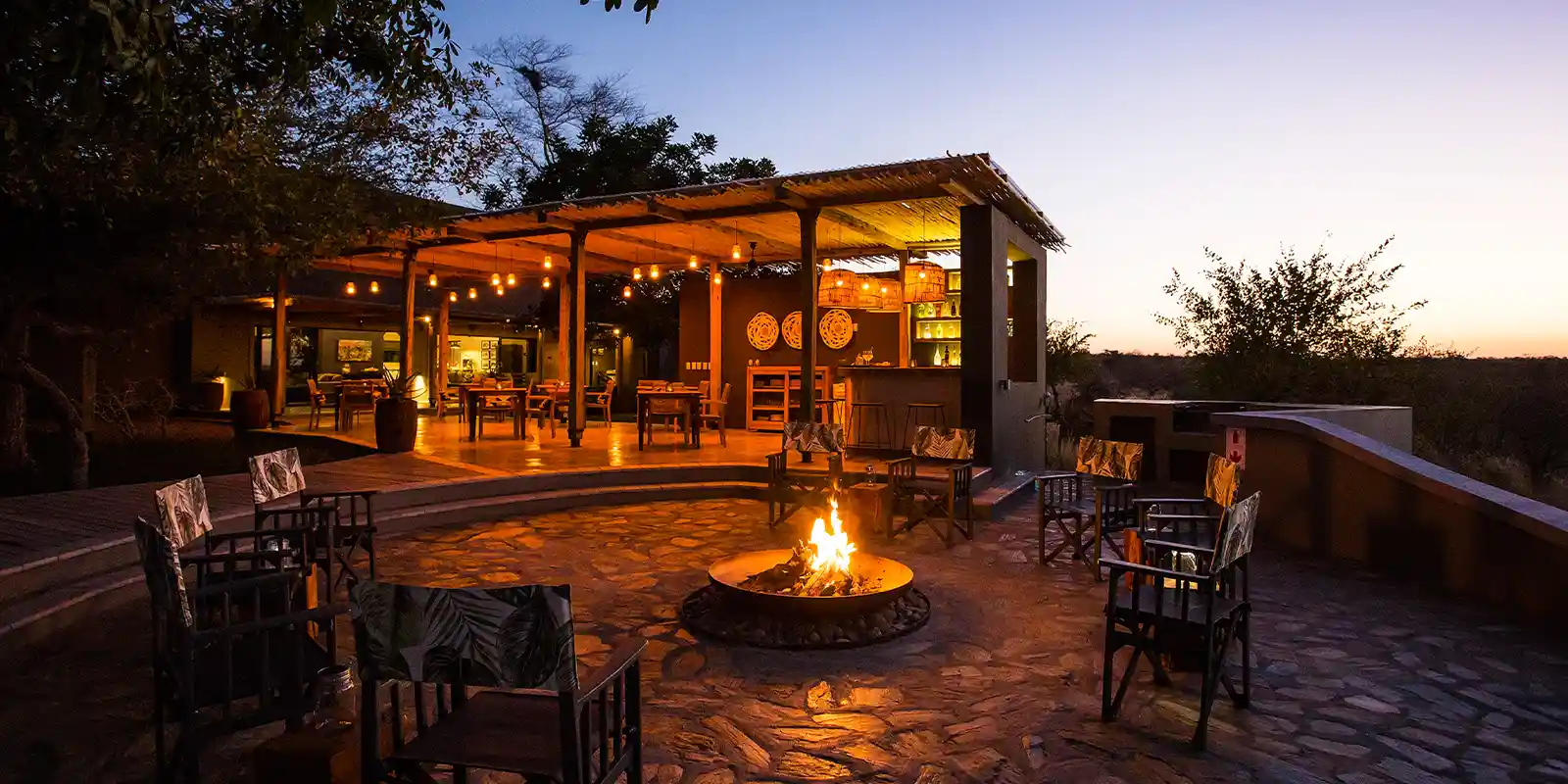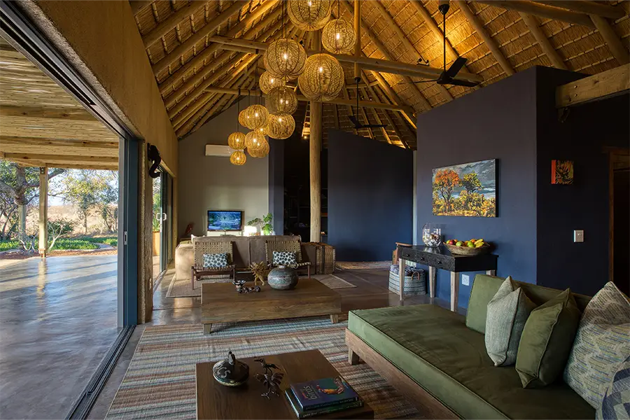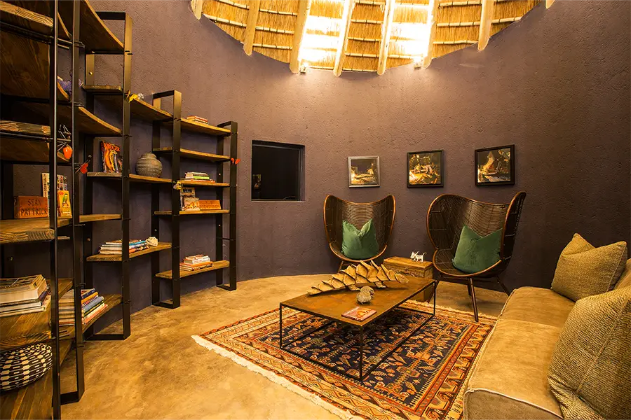 An additional dining area can be found closer to the main lodge, leading to the boma area, where guests can enjoy a drink and fireside chat before or after dinner. The interior consists of a spacious and stylish lounge with satellite TV and library with warm, inviting tones, ideal for curling up with a book during cool winter nights.