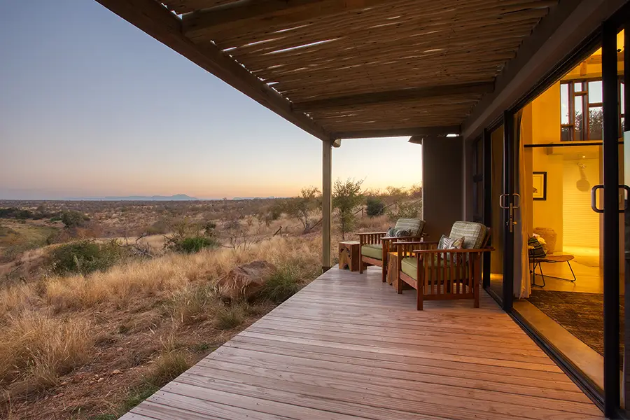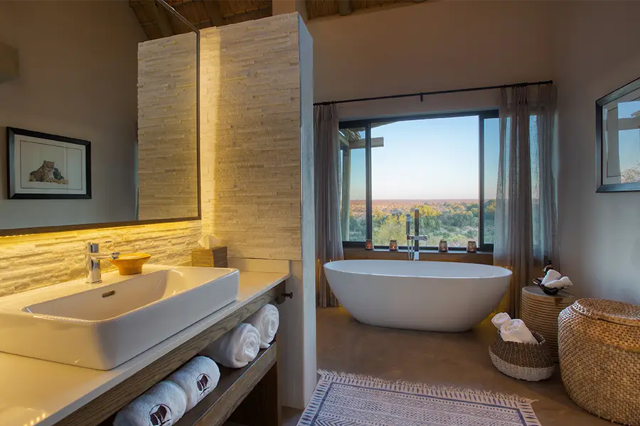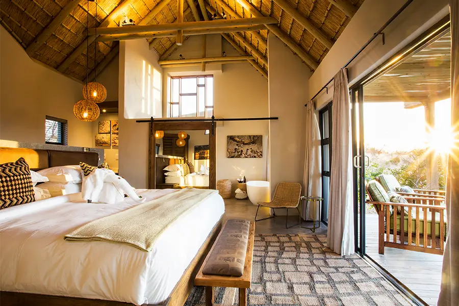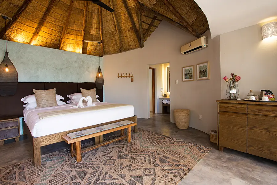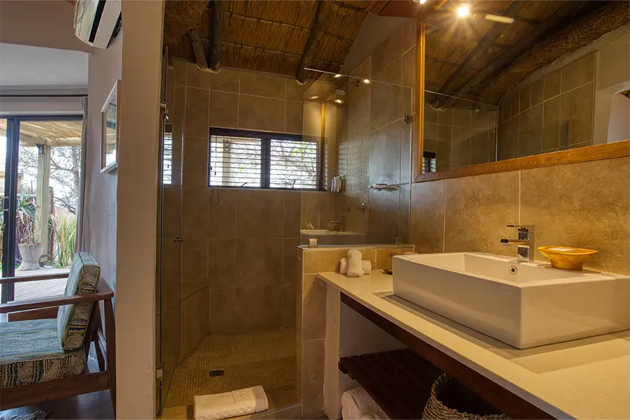 Each of the air-conditioned rooms is decorated with earthy tones to match the bush setting, and thatched roofs continue the natural aesthetic, maintaining an African style with a modern approach. The garden view rondavels are a throwback to the original camp structures, now equipped with en suite facilities and a private deck where guests can practice yoga using the mats provided. The river view suites offer ultimate seclusion and privacy, where couples can find time to relax and connect with a private deck and both indoor and outdoor showers.