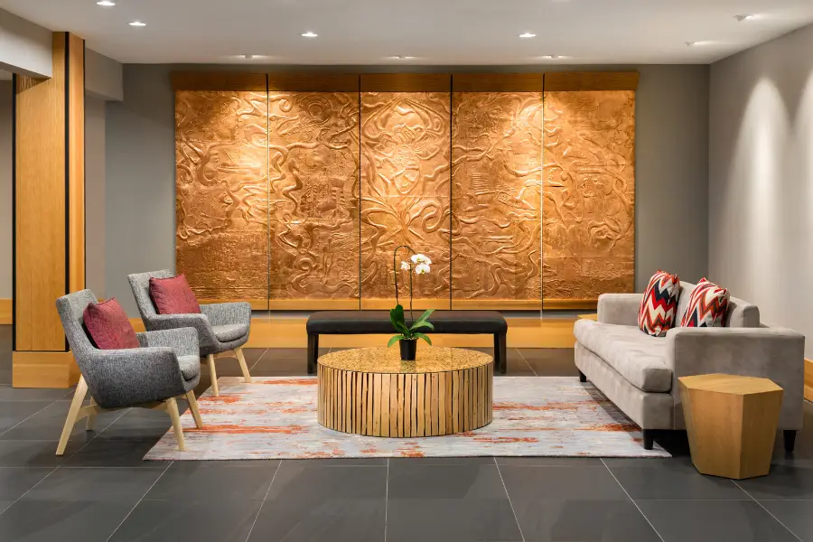 Upon entry, guests are greeted by a stunning 5-metre wide centrepiece depicting the history and the legends of the Gwa’sala Nakwakda’xw people before checking in.