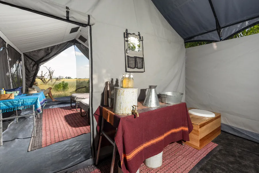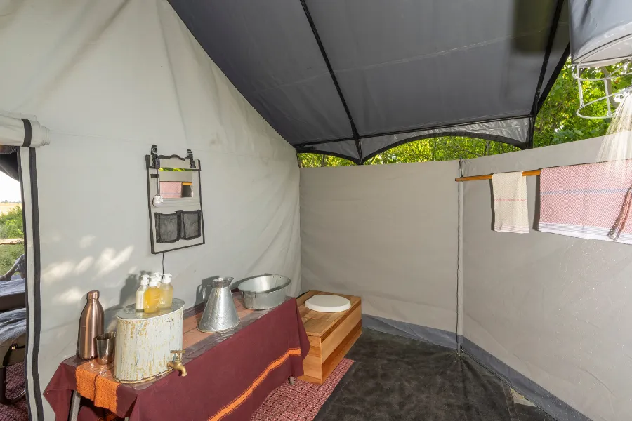The open-air bathrooms have no running water, however consist of rustic amenities such as a refillable warm jug for face washing, hand wash station and drinking water, each topped up daily by staff (or on request). Bucket showers offer an adventurous bathing experience with the water heated over fire, and refuse is disposed of in a compost toilet, emptied daily. Both camps also feature a mess tent where meals are served and cameras can be charged, along with a comfortable lounge area, coffee station and campfire.