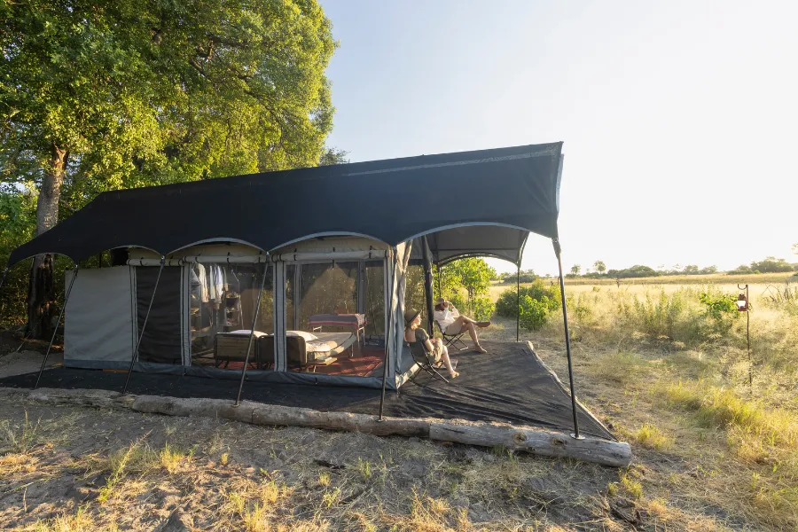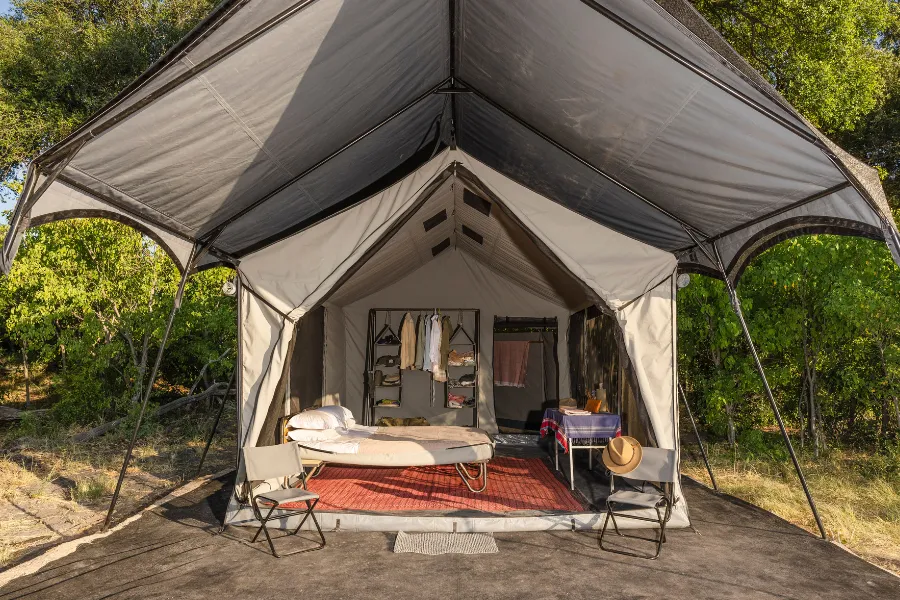Each property comprises five simple yet elegant Meru style en suite safari tents, featuring comfy beds with crisp Egyptian cotton linen, USB and USB-C charging facilities, ceiling fan, a hanging canvas wardrobe and luggage rack, and a private deck with directors chairs overlooking the surrounding waterways where wildlife often passes by. The rooms are kept cool throughout the day due to their shady location, offering the perfect relief during the midday sun.