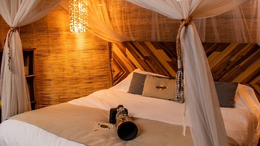 Built and run by Derek Shenton, it shares the same level of service as Kaingo, and its hides have been used by the BBC, Discovery Channel and the National Geographic, as well as by some of the world's top wildlife photographers. Mwamba consists of three reed and thatch chalets, equipped with en suite bathroom with hot bucket shower and flushing toilet. Lighting is solar-powered, and each chalet has skylights in the roof, allowing guests to experience sleeping under the stars.