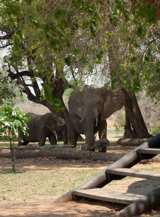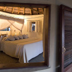 The dining room overlooks the river at the spot where elephant come to drink and cross. Wildlife grazes on nearby a terraced area during the day, and tucked in beside a huge extinct termite mound, the bar and sitting room overlook a waterhole frequented by wallowing warthog and buffalo, and – especially – leopard at night. There is a hide overlooking the lagoon, where you can watch wildlife coming to the waterhole to drink.