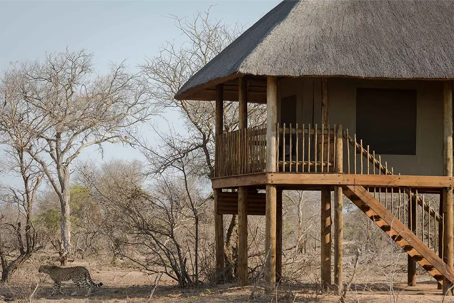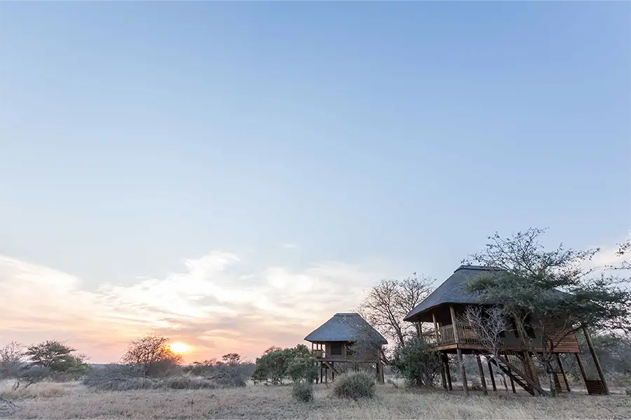 nThambo Tree Camp offers exclusivity and unique accommodation within the Klaserie Private Nature Reserve, with five chalets built on stilts and views extending to the Drakensburg mountains in the distance.