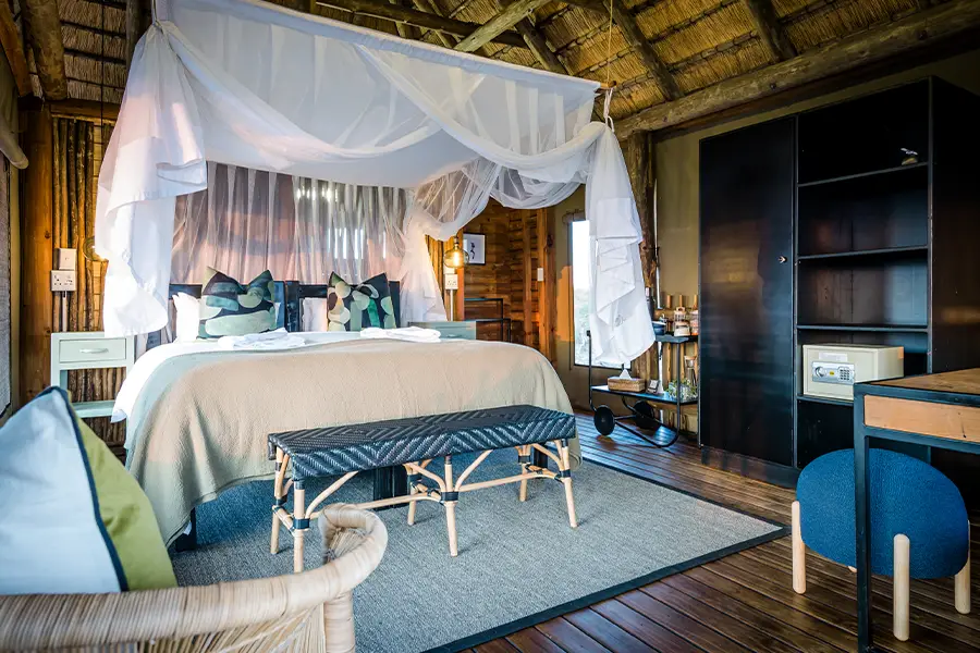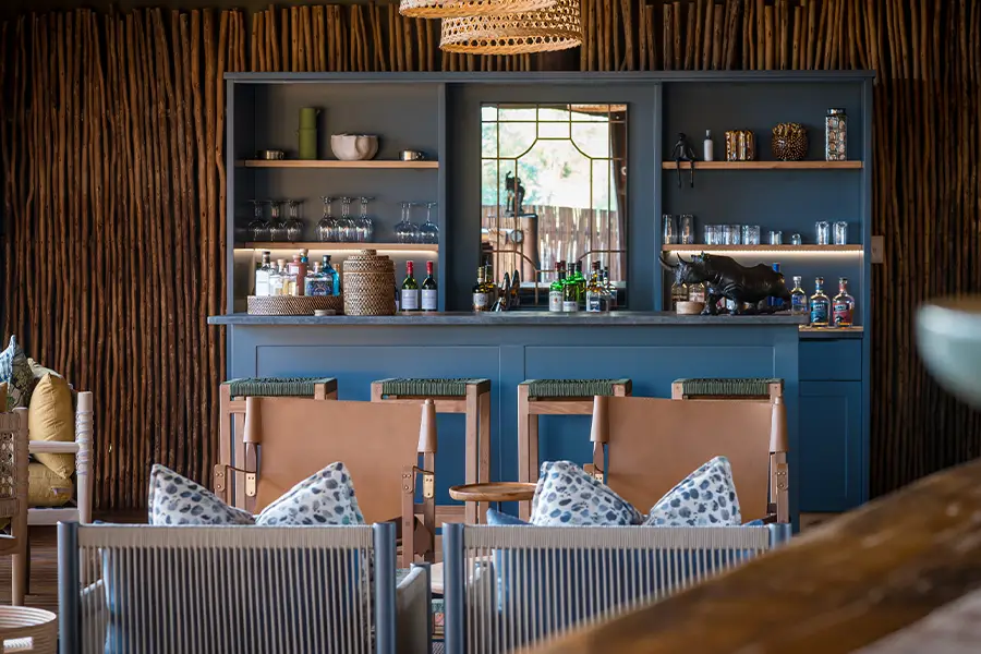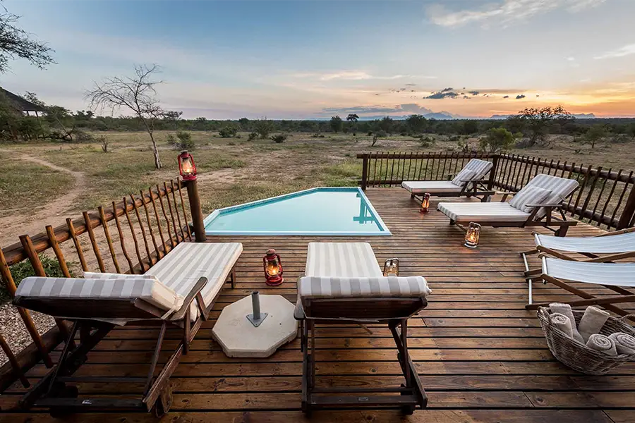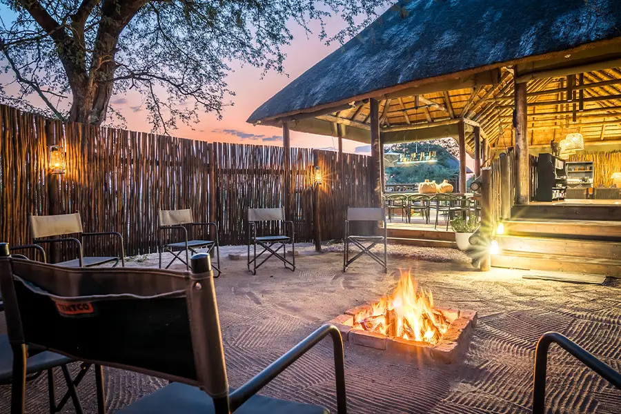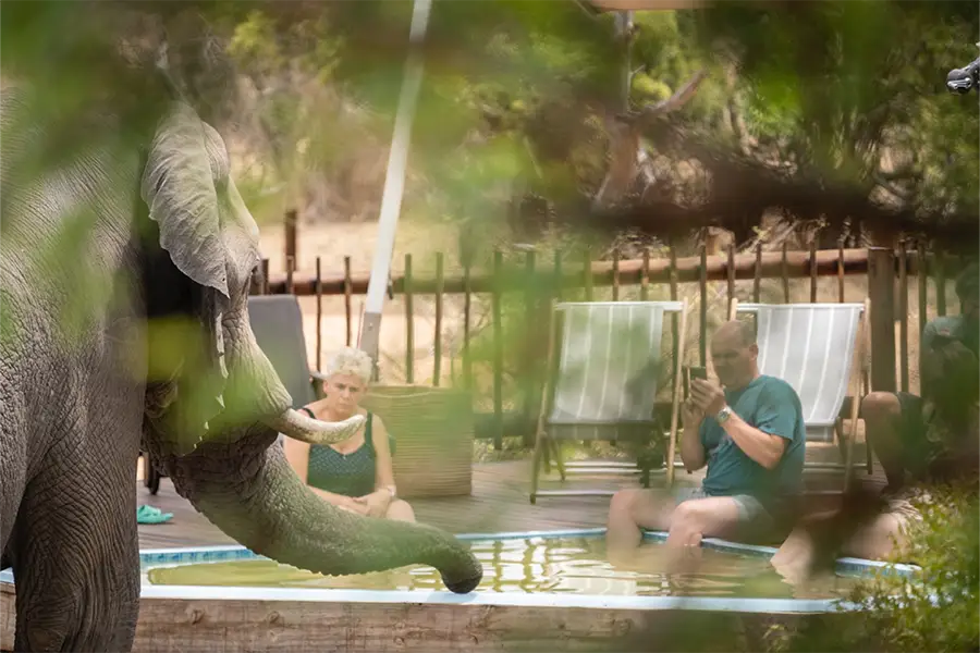 This unfenced property often has wildlife pass through camp, with a particular highlight being the elephants that regularly come to drink from the splash pool, particularly in the dry winter months, in front of the stylish bar and dining area. Guests can sit on the opposite side of the pool and watch as the behemoth mammals guzzle gallons of water just metres away, with the elevated deck creating a safe barrier. A small waterhole is positioned in view of camp where smaller species may come to drink during the heat of the day, and a rustic boma area completes the traditional bush camp experience, perfect for trading stories under the stars with other guests.