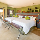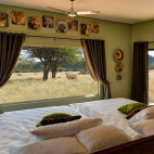 Finally, ten spacious and exclusive View rooms were completed all offer a view across the plains. The rooms are set 25-75 metres apart, some distance from The Barn, which affords greater privacy. In addition to the facilities offered by the Standard rooms, these have a large verandah, a larger shower, a desk and a comfortable chair for reading. Two of the View rooms form a single large two-roomed family-unit.
