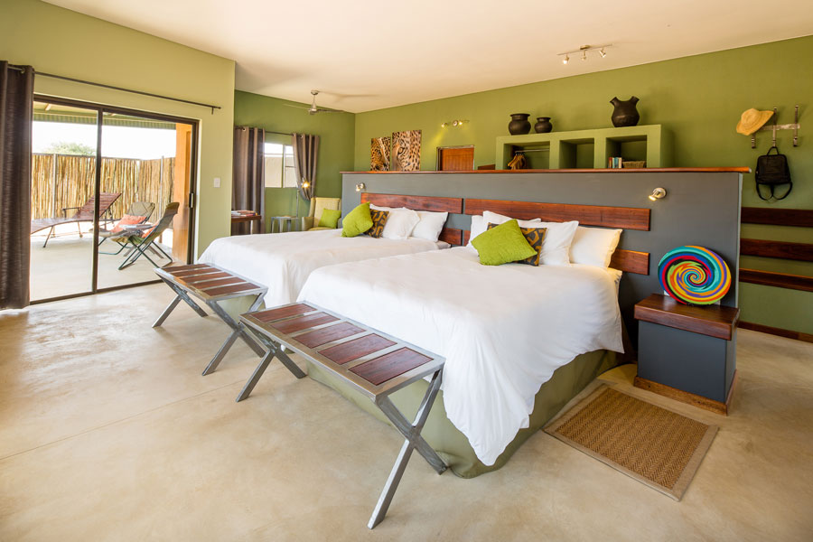All 14 Standard rooms, on the other hand, enjoy a view across the plains of Okonjima. Each room has two double beds, an en suite bathroom with twin basins and a shower, a small verandah, tea and coffee-making facilities, two roof fans, mini-fridge, safe and a ramp for wheelchair access. Four of these rooms form two large family units.