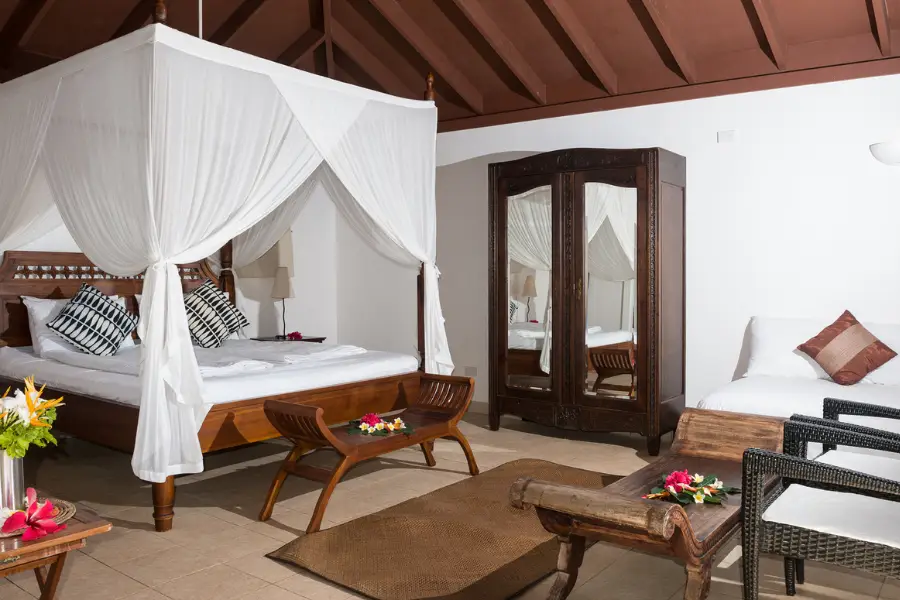 Reef Resort features just five spacious falés, each designed to embrace the island’s natural beauty. Thoughtfully furnished with a mix of traditional craftsmanship and modern amenities, the falés offer fans, en suite bathrooms, and private decks—ideal for admiring the beautiful ocean views.