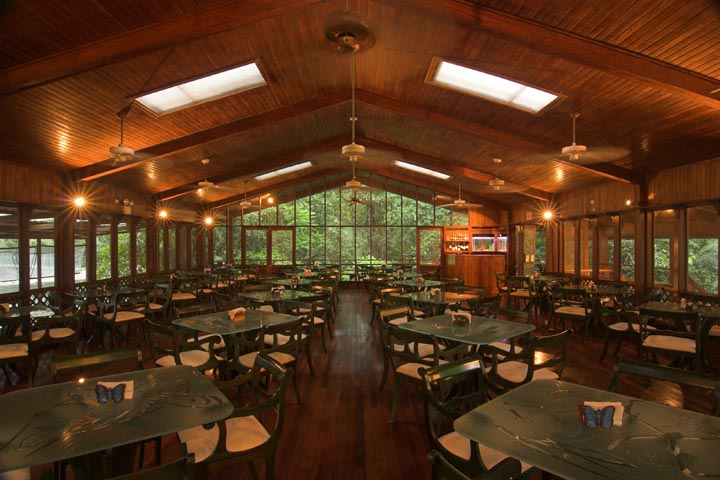 The combination of comfortable accommodation and rich biodiversity makes this an ideal spot for bird and wildlife enthusiasts. The riverside lodge is built on a series of elevated wooden platforms, which are connected by covered wooden walkways that blend in with the rainforest surroundings. This ensures you can move around and stay dry even while it is raining – which happens frequently. Of the two restaurants, one serves predominantly Italian food, the other Costa Rican.