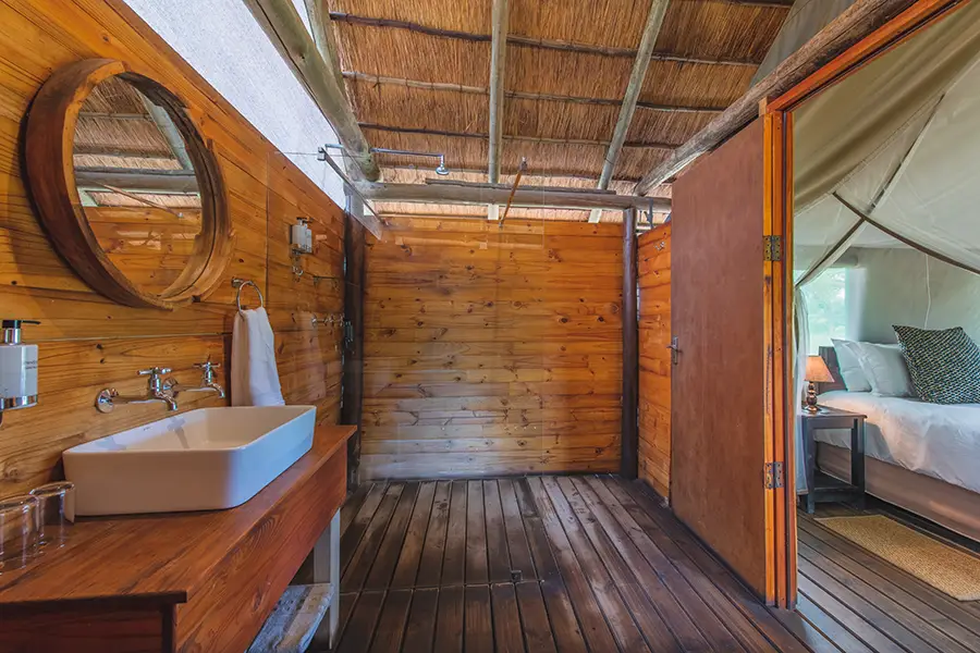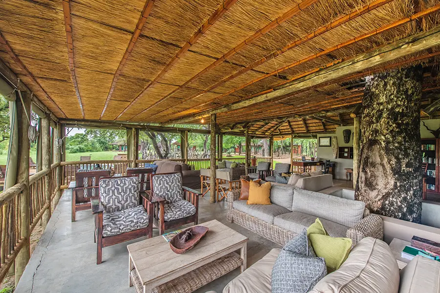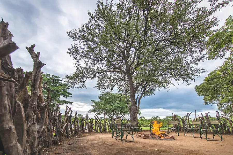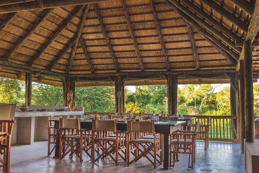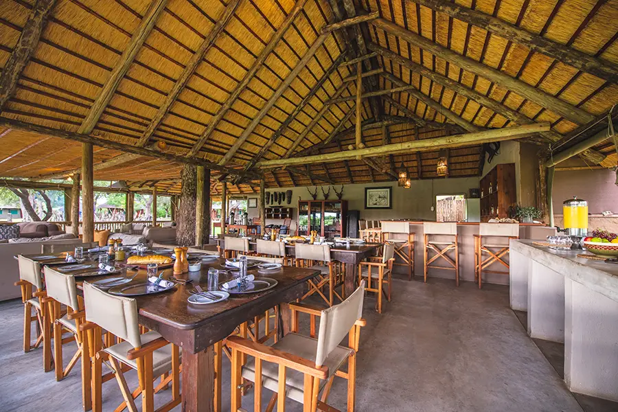 Surrounded by the bush, the camp’s main area consists of a comfortable open-plan lounge and dining space with views of a dry river bed and small watering hole where wildlife often come to quench their thirst during the heat of the day. A small swimming pool offers an alternative place to relax between game drives, unwinding on a sun lounger whilst listening to the birdsong all around. Dinners are served in an open-air boma where weather permits, and the friendly staff strive to make guests feel at home, doing all they can to ensure an unforgettable safari experience.