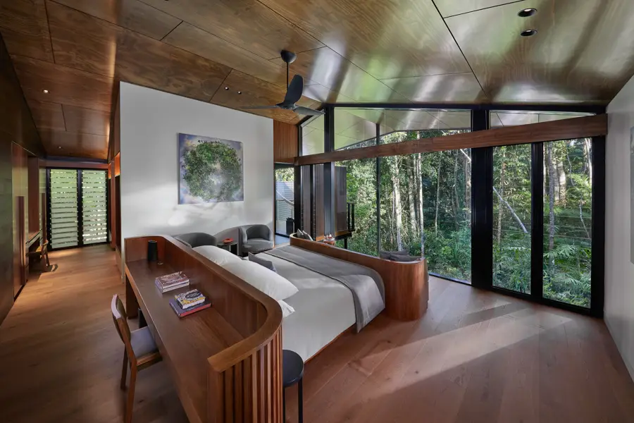 The elegant contemporary accommodation, styled with tropical influences, creates a relaxed and soothing ambience that complements the natural surroundings. Various categories of room – all constructed from local hardwoods – stand on stilts in the rainforest, with floor-to-ceiling windows that open onto a spacious balcony with a panoramic view over lush gardens, rainforest or river. All are fully air-conditioned and feature king-size beds, a day bed, bathrobe and slippers, minibar.