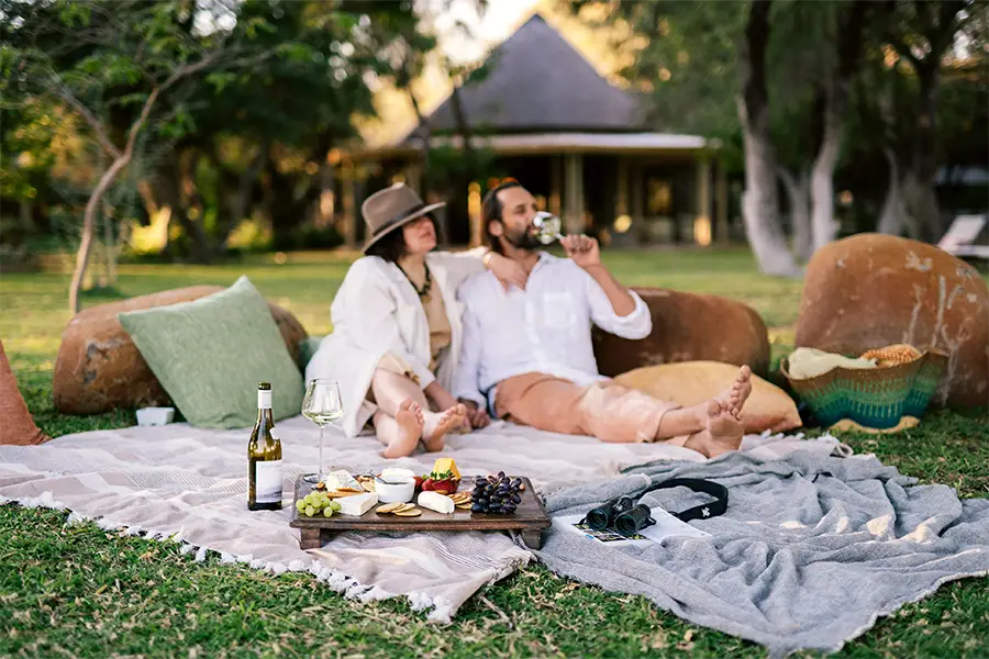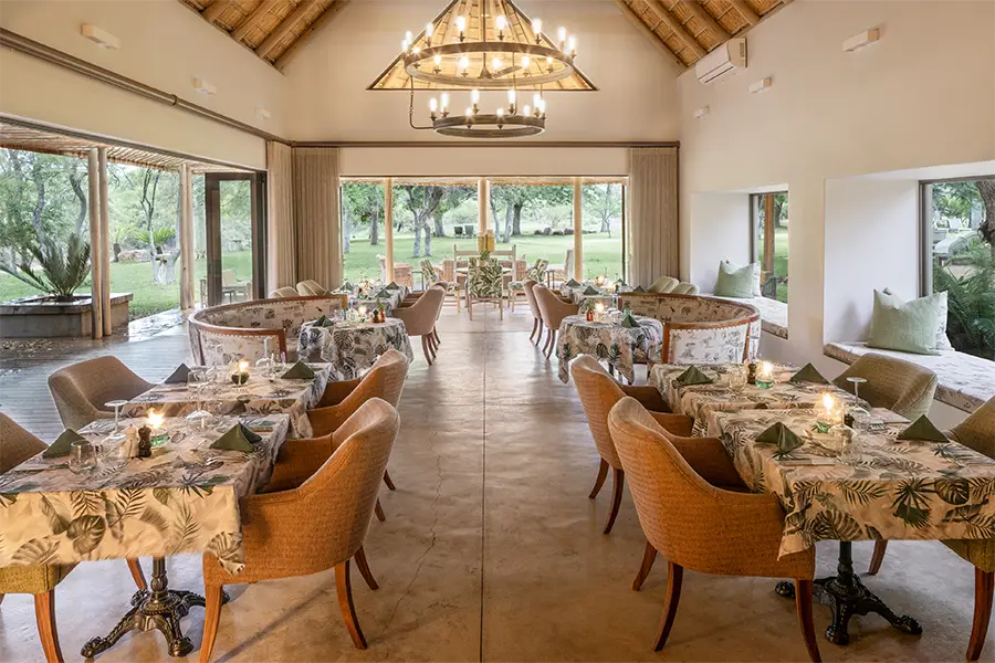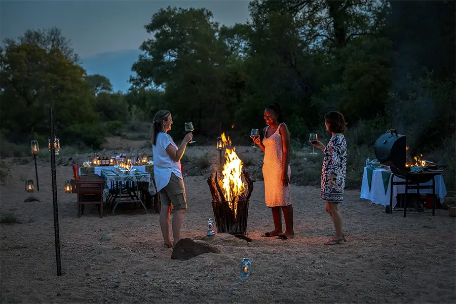 Meals are served either in the main lodge or, weather permitting, around the fire in the outdoor boma, intimately lit up with lanterns and uninterrupted views of the countless stars illuminating the night sky. Top quality imaginative cuisine is prepared with fresh seasonal produce, and a varied selection of fine South African wines are stocked to find the perfect pairing.