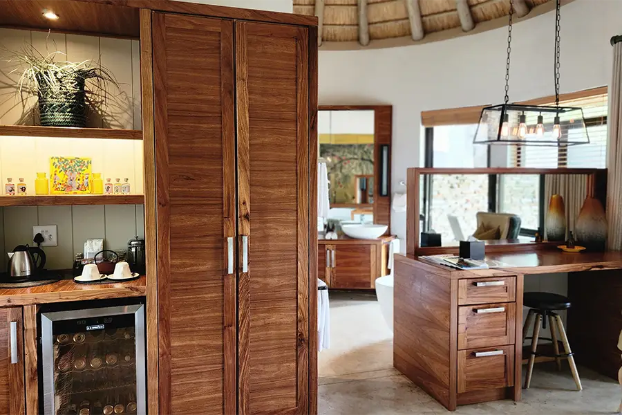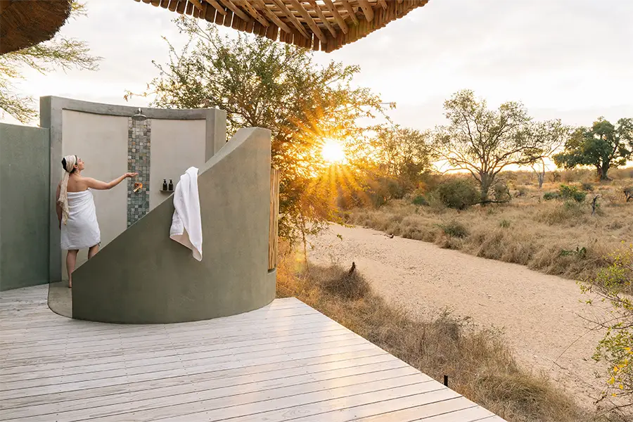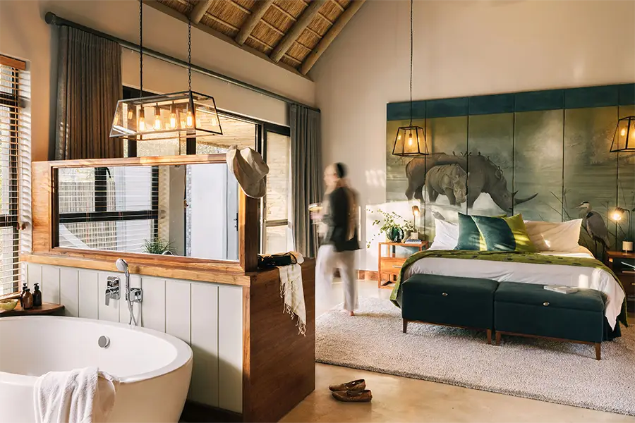 The air-conditioned luxury suites each have a private deck overlooking a dry riverbed, with outdoor showers enjoying views of the surrounding bush as wildlife passes by. The interiors are a picture of safari elegance, furnished with indigenous wood furniture and a king-sized bed. The unique headboards by artist Dianne Christian depicting a different animal in each room are a standout feature, coupled with the contemporary artwork throughout the camp. En suite bathrooms are incorporated into the open-plan design, and are complete with decadent freestanding oval bathtub, indoor shower, double vanity unit and separate flush toilet. Two of the units are inter-leading to provide a perfect space for families.
