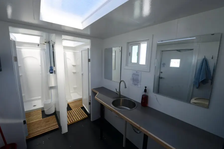 The camp provides shared shower and toilet facilities, designed to balance guest comfort with environmental sustainability.