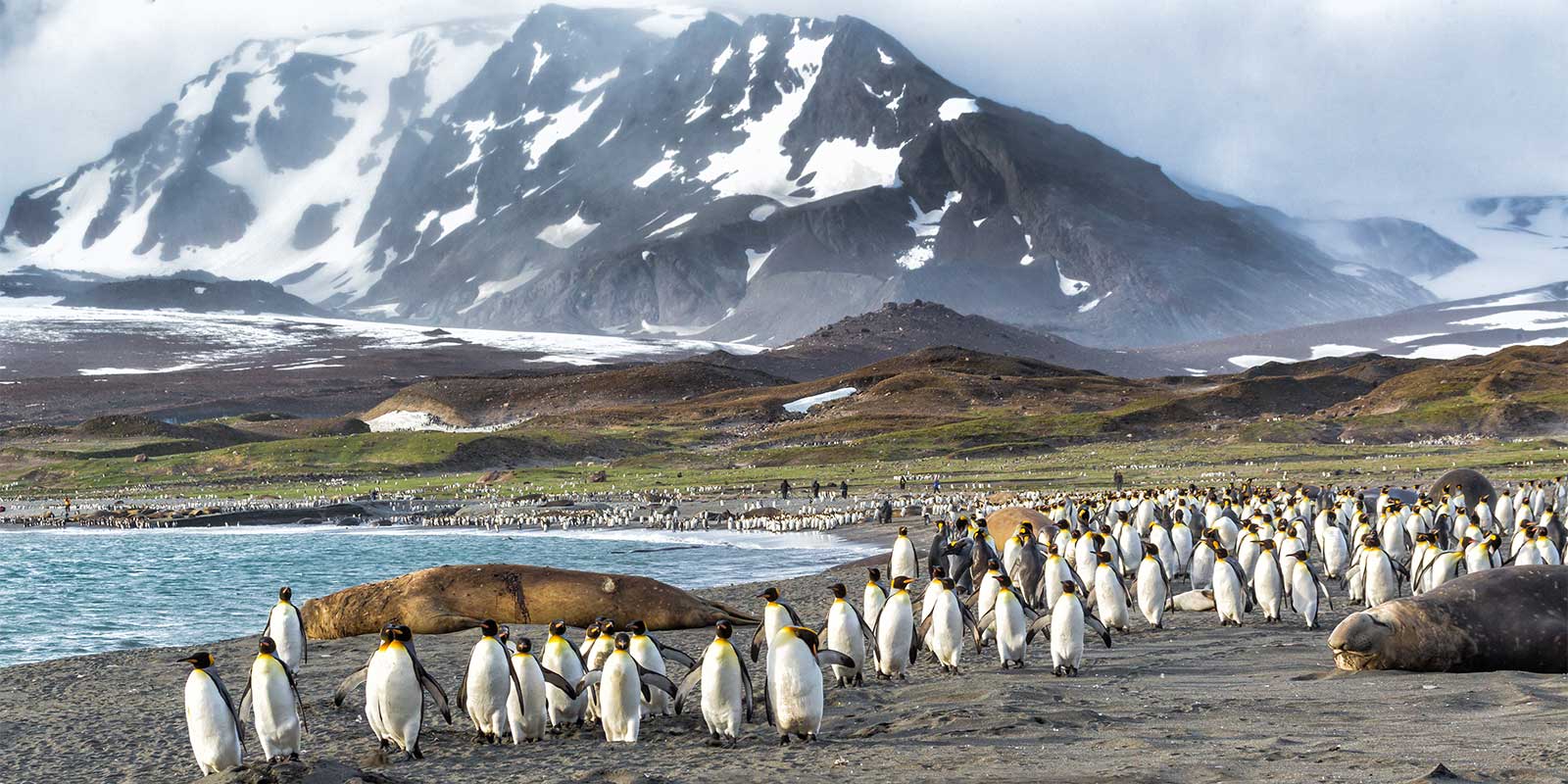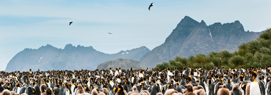Salisbury Plain is, for many of South Georgia's visitors, the ultimate location. The dramatic black sand beaches and tussock-covered dunes are home to a staggering abundance of king penguins and their young. This rookery, one of several such king penguin colonies on South Georgia, is estimated to number up to 100,000 birds, and we can photograph and enjoy this vast penguin colony inhabiting such a remarkable setting.