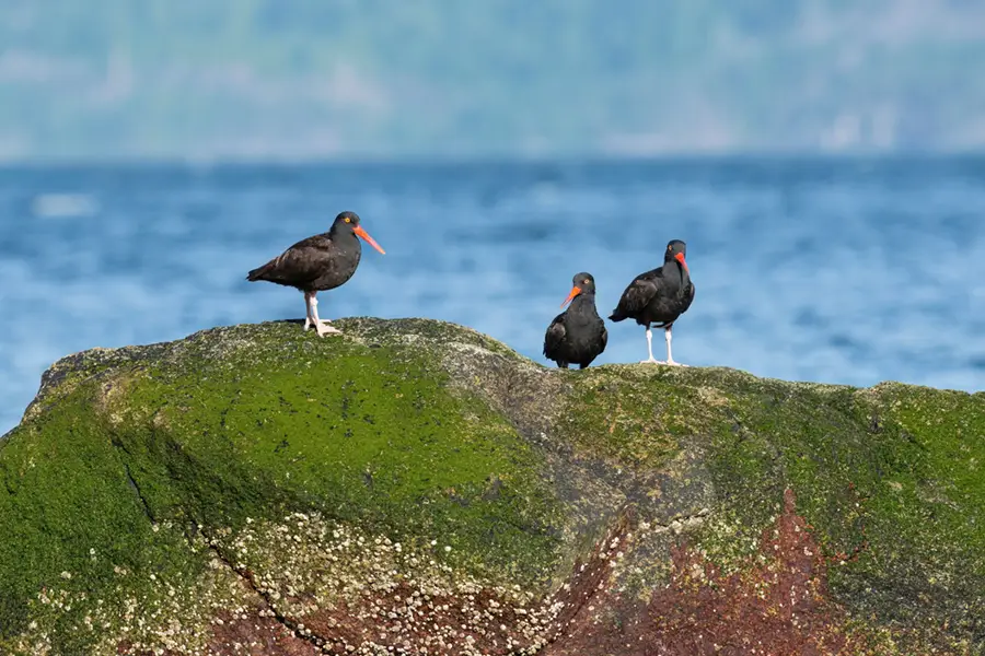This area has a rich and varied bird population: an amazing number of bald eagles, ravens and various species of gulls gather in the estuaries to feed on the spawning salmon. A variety of other birds, such as the common merganser, black oystercatcher, American dipper and Steller's jays are also common visitors to the rivers of the rainforest.