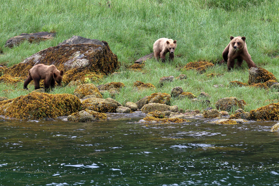 Since it was established in 1994 (the world's first conservation area of its kind), Khutzeymateen Grizzly Bear Sanctuary offers coastal brown bears an area free from the depredations of hunting and logging, where they can feed and rear their young without risk. Scientists estimate that around 50 grizzlies are protected by the no-hunting policy of Canada’s only Grizzly Bear Sanctuary. The headwaters of Khutzeymateen Inlet are protected, and the area was recently expanded to include the entire inlet as the Khutzeymateen Conservancy. As one of the few operators permitted to travel into this area, this voyage provides a unique and intimate bear viewing experience, using Zodiacs to venture right into the estuary where the bears are feeding.