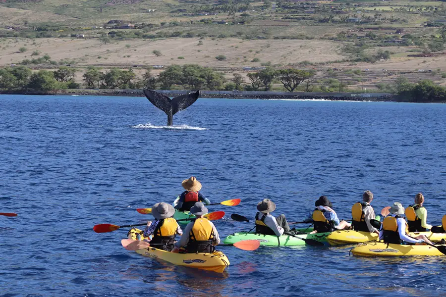 Begin your day with a kayaking excursion, paddling along Maui's hidden coves. Later, venture to Lana'i, where you explore hidden coves and secluded spots. Afterwards, cruise along Moloka'i's dramatic northern cliffs, where soaring sea cliffs and playful dolphins create a breathtaking scene.