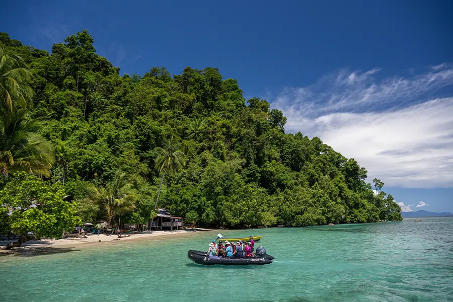Other activities include beach visits, snorkelling, guided forest walks, and exploration by traditional longboat.