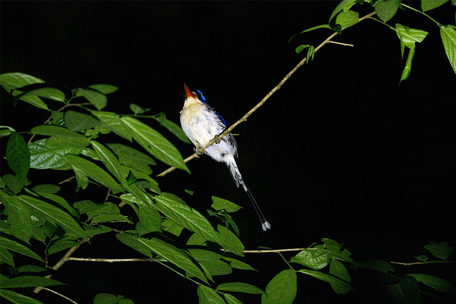 Starting well before dawn, you head ashore to meet with your local guides, who lead you through the forest to the lekking trees of the red bird-of-paradise, where you can hope to witness their outlandish courtship display. The male of this remarkable species has a long cape of red feathers on his back, which he quivers at the frenzied peak of his display. In addition to other forest birds, you may encounter a non-lekking bird-of-paradise, the glossy-mantled manucode.