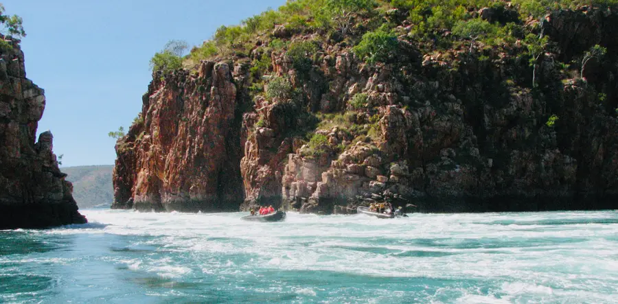 Horizontal Falls - Experience powerful tidal surges racing through narrow gorges to form the famed Horizontal Falls, set among the ancient islands of the Buccaneer Archipelago, where marine life gathers in fast-moving waters.