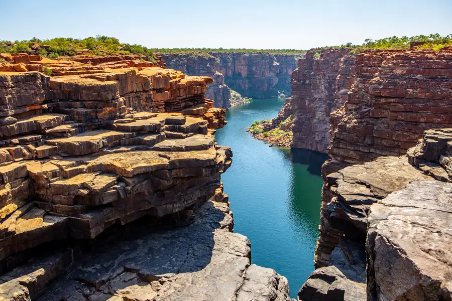 King George River - Cruise through a dramatic 400-million-year-old river gorge, where towering sandstone cliffs and honeycomb formations frame sightings of freshwater crocodiles basking along the water’s edge.