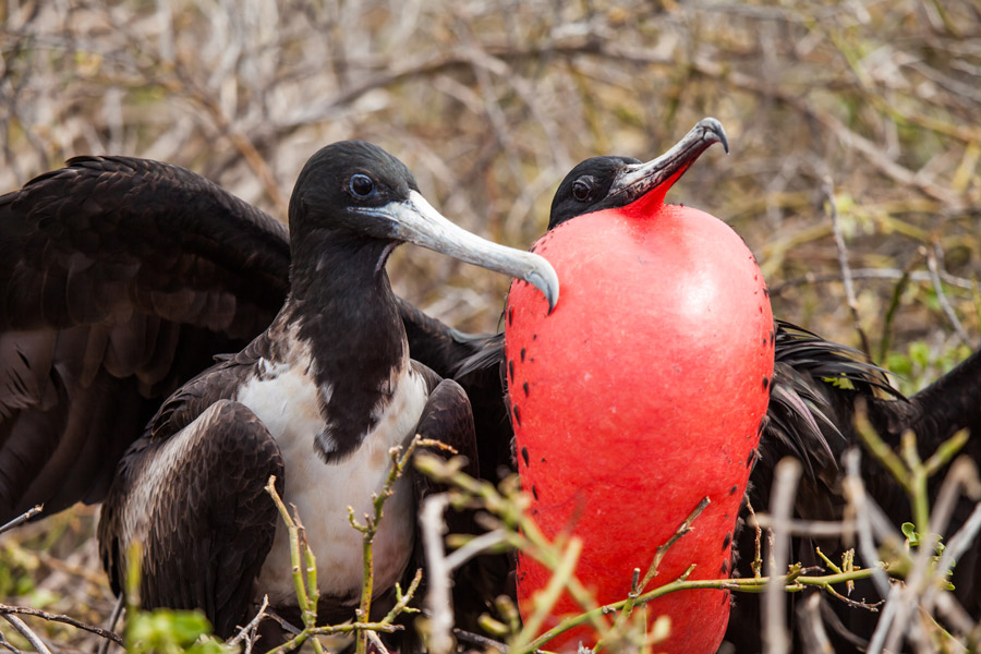 Today starts on South Plaza, a small islet with tall cliffs and a trail sprinkled with various plants and animals. Look for a variety of bird nests, such as swallow-tailed gulls, shearwaters, small ground finches, and red-billed tropicbirds. You’ll also have an opportunity to see a colony of bachelor sea lions and land iguanas. We then sail to North Seymour, where a spectacular sight awaits - frigatebirds with red inflated sacs on their chests, seeking mates.