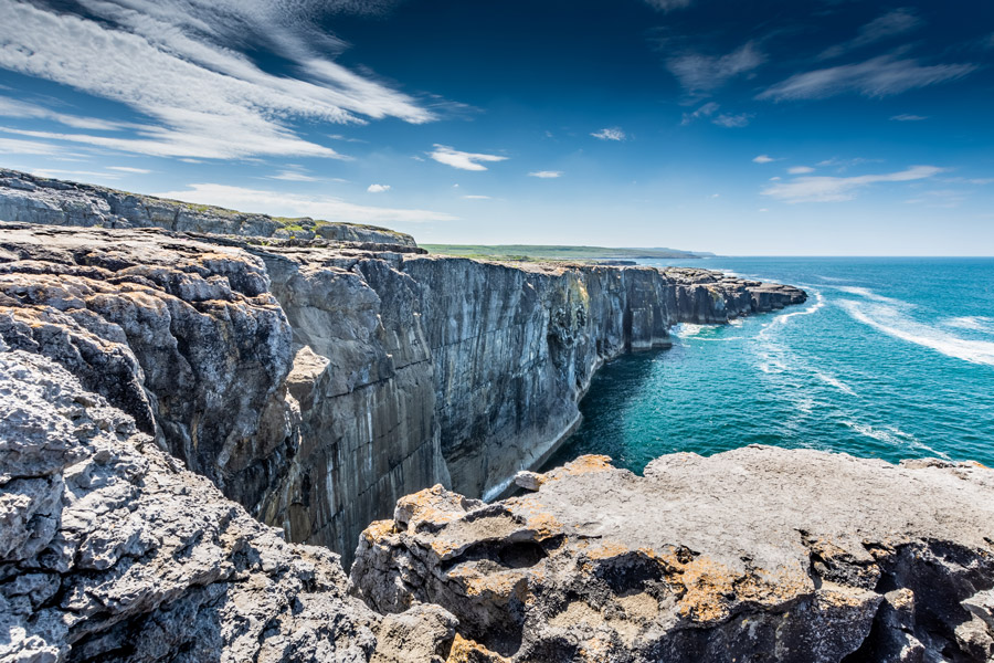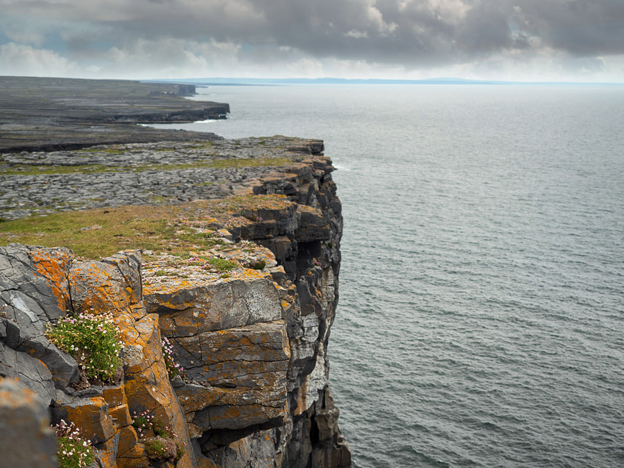In the afternoon we return to Inis Oı́rr, whose name is derived from the Gaelic Inis Oirthir, meaning ‘island of the east’. The smallest and most easterly island (closest to the Galway coast) covers an area of less than three square kilometres. Geologically speaking, it is an isolated exposure of the Burren, consisting of bare limestone pavement that at one point rises to an elevation of 60 metres. With its breathtaking scenery and distinctive flora it’s a walker’s paradise, with few motor vehicles. The traditional mode of transport is to hire a pony and trap at the pier, driven by a friendly islander who will natter on and answer questions about island life. But by far the best way to get around here is by walking, as this gives you a better feel for island life; the clearly marked trail that leads around the island takes some four hours to complete.