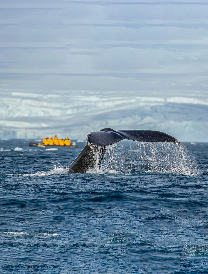 Over the next few days, the Antarctic Peninsula’s west coast is yours to explore. Chinstrap, Adélie and gentoo penguins can all be found here, along with Weddell, fur, crabeater and leopard seals. During Zodiac cruises, as you glide between brilliant blue icebergs, keep an eye out for cetaceans, including humpback and minke whales. Daily excursions are planned by your expert expedition team, including shore landings, guided hikes, visits to penguin colonies and historic sites, or a Zodiac cruise in scenic bays.