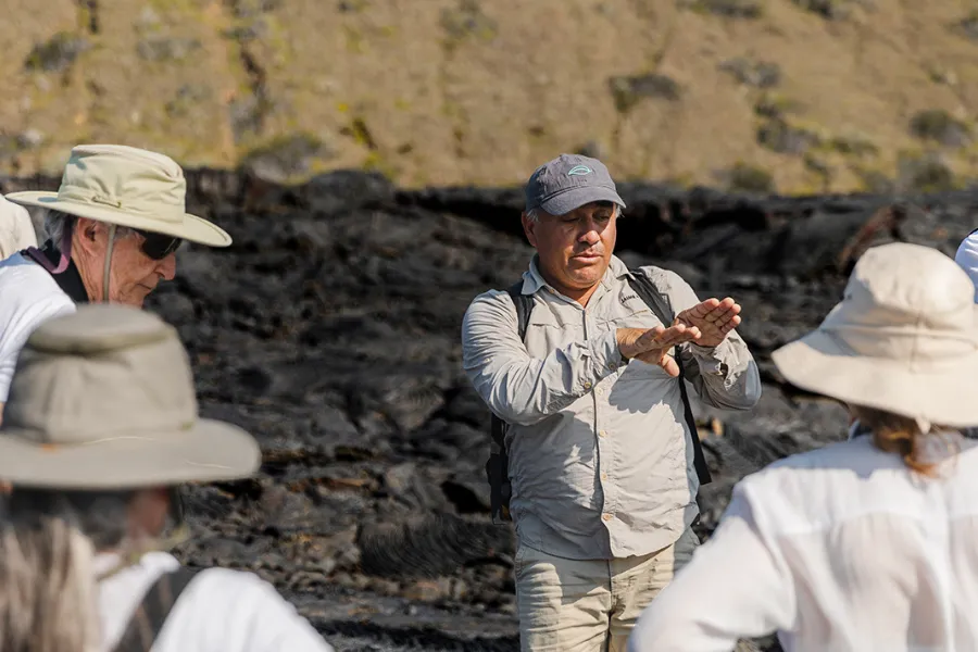 After a night of sailing, this morning you anchor on the western side of Isabela Island. This morning, enjoy a hike at Punta Moreno to see the mangroves and gas-rich basaltic lava rocks. You're likely to observe marine iguanas, flightless cormorants, and penguins, among other species.