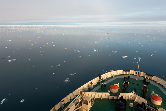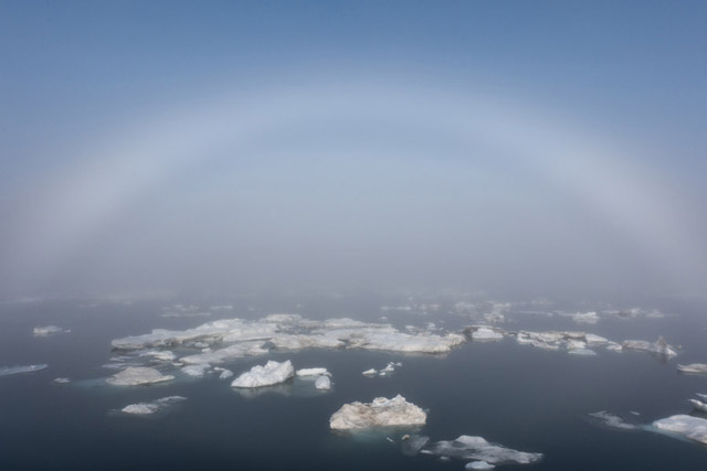 One morning, I looked out of my porthole when I woke up at 3am and saw that the light and mist was looking the best yet, so I jumped out of bed, got dressed and went outside. I met Joe Cornish on the way out and we admired the view together, being rewarded soon after with an incredible Fogbow, a beautiful phenomenon similar to a rainbow, where the water droplets in the mist reflect the light.