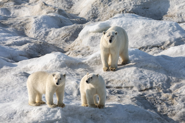 Gradually more people started to come out to the deck and soon after, we spotted a polar bear on the ice nearby. As soon as it got to around 05:00am the expedition leader made an announcement and we now had about six polar bears in view, including a couple of mothers with cubs in beautiful light. We slowed down and by the time breakfast was served, we’d seen 16 bears. Not a bad start to the day! We saw over 50 bears in total – an unbeatable experience and a real privilege.