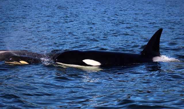Watching these whales free in their home waters is a gift. Acrobatic foraging and play behaviors lend to our fascination, as their vast intelligence and sensory capabilities keep them one step ahead of our research. A quick camera will catch the newest calves breaking the surface, still yellow with jaundice and retaining a slight wrinkle to their skin. Each Southern Resident is given a name by researchers for documentation purposes, and their unique ‘saddle-patches’ allow us to recognize them and follow their movements from ship or shore. The life stories of individual whales such as Rhapsody, Ruffles, or Taku are certain to capture hearts, staying with visitors long after they have returned home.