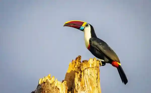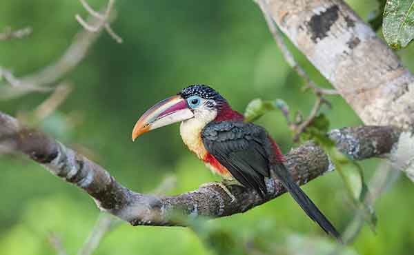 Considered iconic Amazonian birds, the toucans are immediately recognised by their colourful, oversized beaks and vibrant plumage. Frugivorous by nature, the toco and white-throated toucans are the largest, best known and most widely distributed species. However, smaller species can also be seen across the basin, including the medium-sized aracaris and diminutive toucanets.