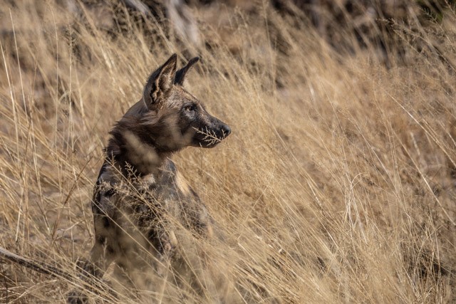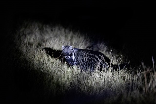 As the sun dipped below the horizon and the sky turned a kaleidoscope of orange and pink hues, we paused at a small lagoon to soak in the scene, observing several hippos emerging from their daytime slumber. Continuing, with the aid of a spotlight, we encountered genets, African wild cat and a serval before arriving at a spotted hyena den, a number of adults and pups in attendance. However, the best was yet to come, and a short time later the vehicles came to an abrupt halt … wild dogs were on the road ahead! First just a few individuals in the headlights, but soon growing to 13 animals, regrouping after a hunt before walking straight past our vehicles. It was quite a welcoming committee to Botswana!