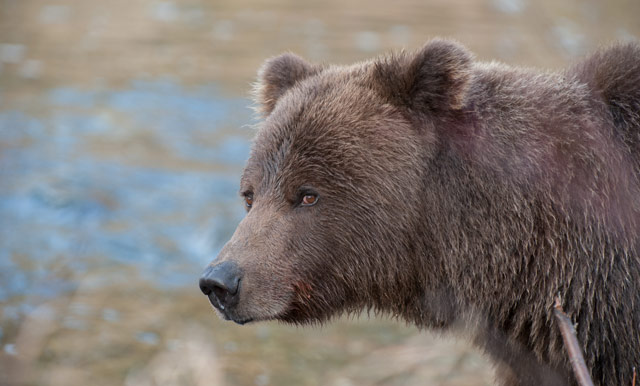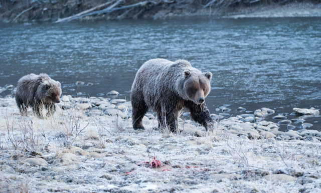 Phil is a force to be reckoned with when it comes to grizzlies - he lets them decide how close is too close, and the bears set the agenda. It is their home, not ours, so Phil is very happy to let them come as close as they want. They are often to be seen having a back-scratch on the tree just outside the kitchen, sleeping right next to the deck, or walking up the walkway right into camp - this is their place and we are just visiting. And it is this, the mutual understanding between man and bear, that makes this such a special place. They know we are here, and are really not bothered about us at all - there are far more interesting things to eat in the river. Phil hums to the bears, Smokey gives a short and not too loud ‘woof’ to tell us they are around, and we just watch them and take photographs.