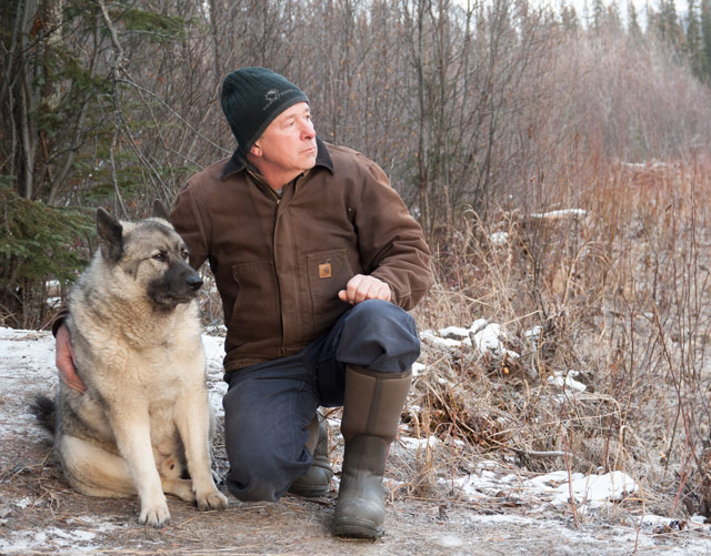 The two-hour flight passed swiftly and we landed beside the river right in front of camp, to be greeted (when the blades stopped turning) by Phil Tympany and his 'bear dog' - a Norwegian elk hound called Smokey. We walked up to the decking walkway and into the small, simple camp where a fire was roaring in the kitchen-diner, and Phil gave us an introduction to the area