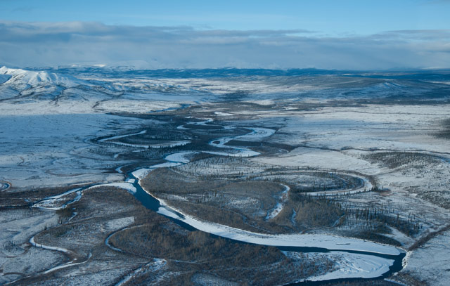We were up early, the weather was good, and we had had word from Bear Cave Mountain that the weather was good there too - so we headed to the helipad and boarded the chopper. Flying over country that can only be described as ‘spectacular’, we watched the tundra unfold beneath us. Mile upon mile of untouched monochrome wilderness - rivers, creeks and forests - all covered with a thick layer of snow and beautifully lit by the sun low in the sky.
