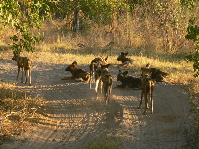 I could hardly bear to watch early one morning as a pack of 13 wild dogs located an innocent herd of impala nibbling on the dry winter grass. Also known as painted wolves, they fanned out like a football team to block all escape routes and approached slowly, their large, round, erect ears like radar dishes, able to detect the slightest sound. Then, hungry for blood, they accelerated at top speed and pounced, ripping apart the weakest impala. I was heartened to learn that after a kill the dogs return to their den and regurgitate the meal for the rest of the family.