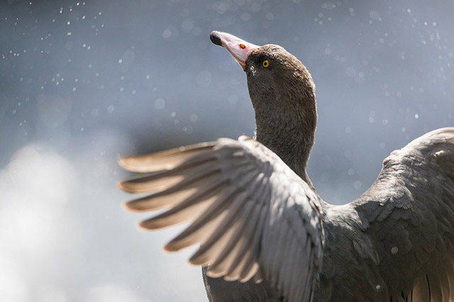 On this particular day I had spent several hours hiking the length of a remote valley on a hot summer's day, carrying a heavy camera and hoping to spot one. Nearing the end of my hike I took a swim in one of the beautiful deep river pools to cool off and dove deep to the bottom. When I surfaced moments later I almost collided with a whio: it was coming into ‘land’ on the pool I was in, landing gear out and arriving in at speed. We were both as surprised as each other, but the whio quickly relaxed and climbed onto a rock just metres from me. Slowly I swam to the river's edge where my camera was resting, collected it and returned into the middle of the river, neck deep. There I was able to take this intimate, low-angle portrait of one of our most treasured species. The encounter lasted several minutes and has personally reinforced in me the urgent need to protect our precious whio.”