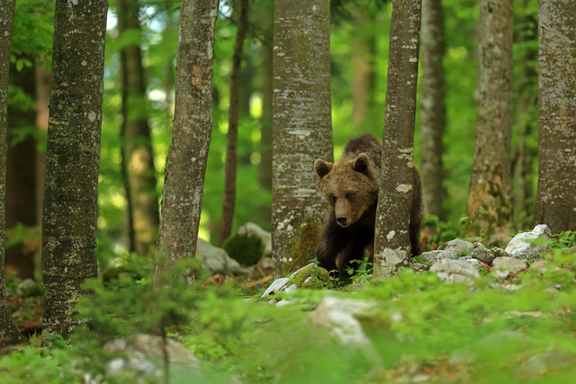 A gentle drumming rings through the air as a black woodpecker searches for food in beech forests of Slovenia’s Dinaric Alps. Cuckoo, cuckoo sounds repeatedly as the cuckoo’s call spreads far and wide. Still there are no bears, but a scold of jays hope from one rocky outcrop to another in search of food. Then finally, a dark shape appears on the edge of the treeline, tentatively approaching the purpose-built hides. Our first bear, a youngster probably only two years old nervously wanders around the partial clearing, hoovering up the corn that is put out each day.