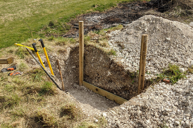 First thing on the agenda was to excavate a hole (a metre deep and nearly two metres long). This all sounded so simple until I realised I was digging through solid chalk and hitting flints weighing up to 30kg. Two days later and the main hole was dug out, with over a tonne of rubble now in a spoil heap beside my excavations. The next challenge was securing the vertical corner posts in the ground - so out came the post hole digger and I excavated four holes another 30cm through the chalk.