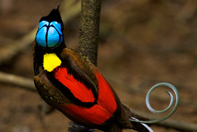 With its dazzling array of electric blue, yellow, red and green plumage, not to mention the violet tail feathers that end in delicate curls resembling fancy ironwork, the Wilson’s is perhaps the most spectacular of these, but they're all truly stunning. Unlike most other members of its family, the male Wilson’s bird of paradise displays at ground level, exploiting shafts of light piercing the forest canopy to inflame his bright colours.