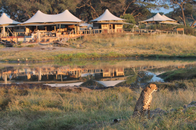 Back at the lodge we sat with our drinks on the deck, as elephants, uninterested by the lion’s power struggle, calmly drank from the waterfront immediately opposite. The idyllic Somalisa waterhole enticed three adult cheetah siblings, who we admired lounging in front of camp in the golden morning light.