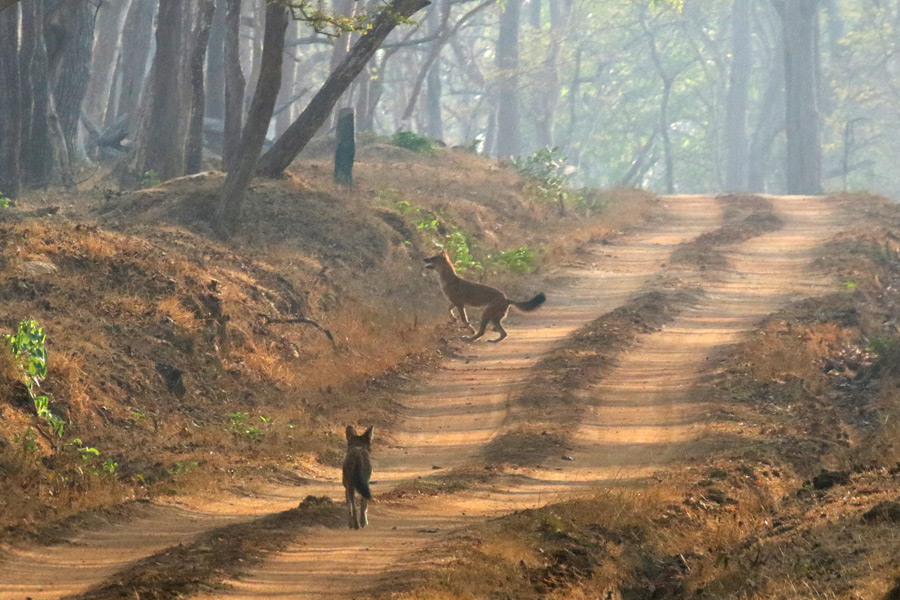 As for Asian wild dogs, they are embarrassingly easy in this lovely park. This season there are two packs in the areas which tourists are permitted to visit. One pack, an established alpha pair and their three full-grown offspring, lives around the forest guesthouse in the park and is seen every day, exhibiting no fear of vehicles. A second pack, a young alpha pair and their five small pups, inhabits the border between tourist zones A and B. In addition to seeing the guesthouse pack on several occasions, my group witnessed the harrowing but remarkable spectacle of the adults of the second pack bringing down a chital buck and then fetching their playful puppies to eat it.