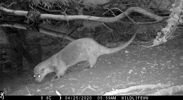 On my most recent check of ‘Otter Cam’ I nearly flicked passed a video, which at first glance appeared to be a false trigger (often camera traps are set off by a gust of wind pushing foliage around). A few seconds into the clip, however, at the bottom corner appeared a rolling shape of two frolicking otters in the shallow water. In the darkness of their river bend the elusive duo played, undisturbed.
