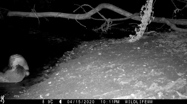 A quick dart onto the screen in the shape of a larger mammal gave me a false alarm... not the otter, but a red fox. This graceful canid made its tentative examination of the camera around 5 am so we unfortunately weren’t graced with the rich russet colours of its coat which daylight affords us.